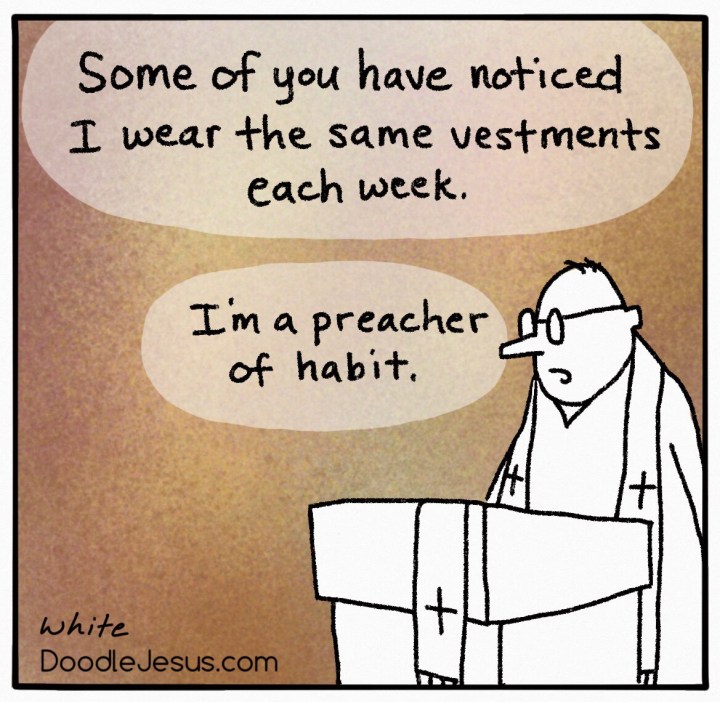 Cartoon below and more thoughts on clerical wear and vocation at DoodleJesus.com