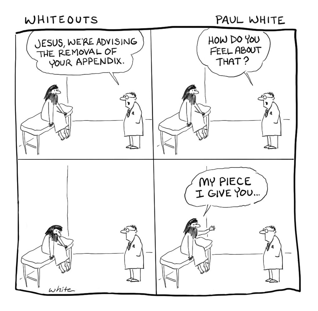 Here’s a cartoon for theology nerds. A more-human-than-divine Jesus bartering with the Holy.