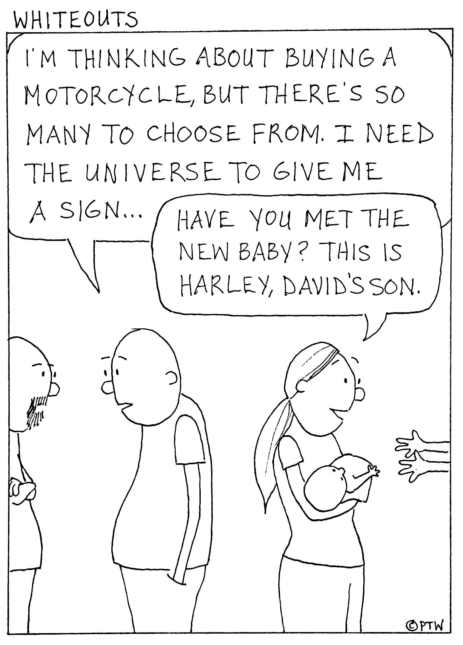 Some friends asked me to create a witty drawing for a wedding gift involving couples, motorcycles, and religion. This is what I came up with. (Although their version has the man asking “God” for a sign rather than the “universe”.) If you want comics created for you on a certain topic I can do that. But it will cost you. 🙂