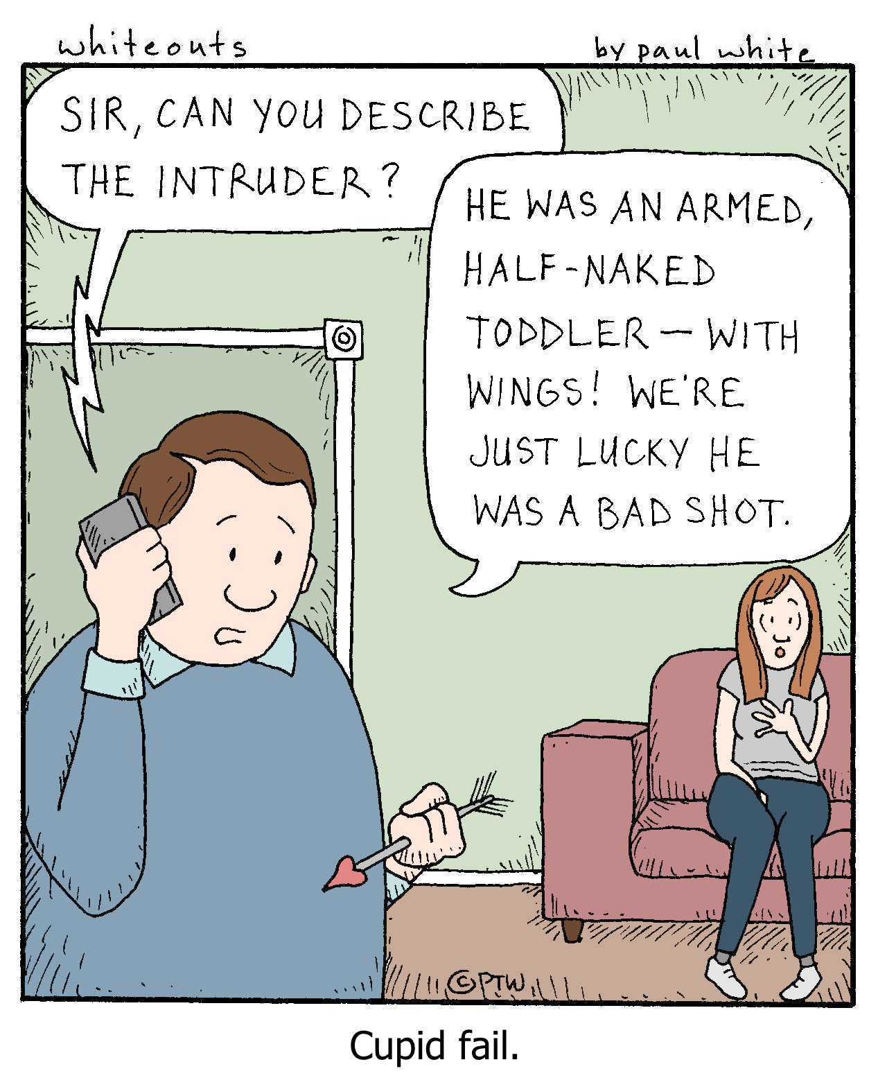 In February of 2014 I decided to see if I could create and post a daily cartoon. As you can see from the first one posted on February 15, 2014 (below) Whiteouts started very crudely. That was intentional; I felt that keeping it basic would take very little of my time and enable me to post regularly. However, as the months passed I found myself slowly improving, refining my style, and caring more and more about the end result.