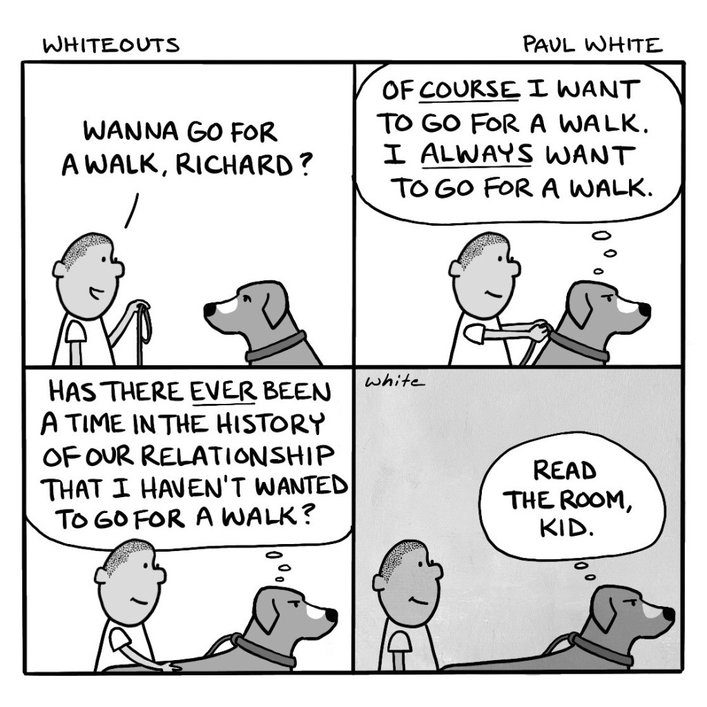 My wife often asks this question of our dog. This is the inner dialogue I imagine for him. Tuesday cartoon…