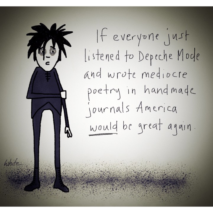 Posted on March 31, 2017 by pablo Gregory’s goth advice Existentially tortured…great…same difference. Share this: Click to share on X (Opens in new window) X Click to share on Facebook (Opens in new window) Facebook Click to share on Tumblr (Opens in new window) Tumblr More Click to email a link to a friend (Opens in new window) Email Click to share on LinkedIn (Opens in new window) LinkedIn Click to share on Pinterest (Opens in new window) Pinterest Like Loading...